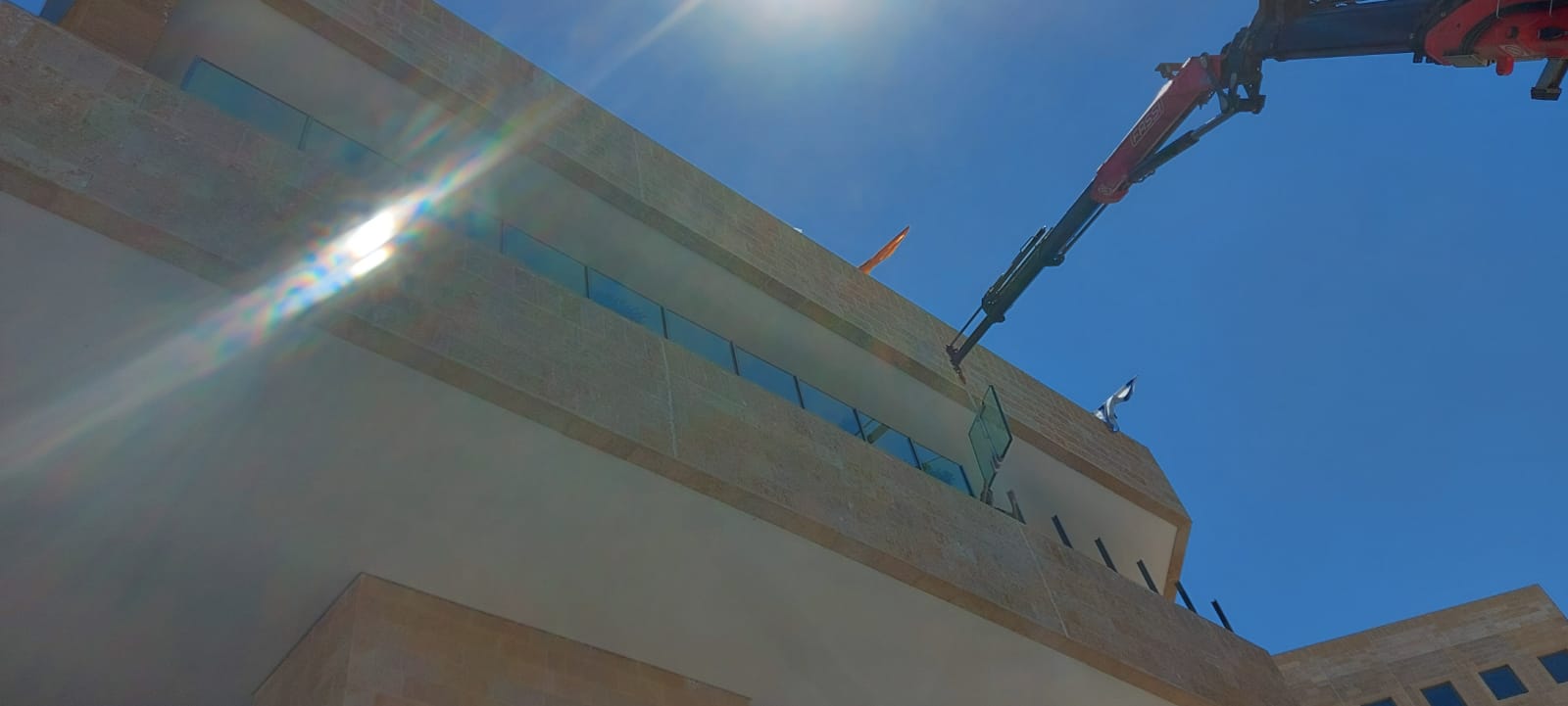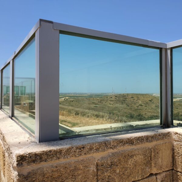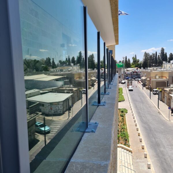 laminated protective glazing, structural steel or aluminum framing, engineered anchorage